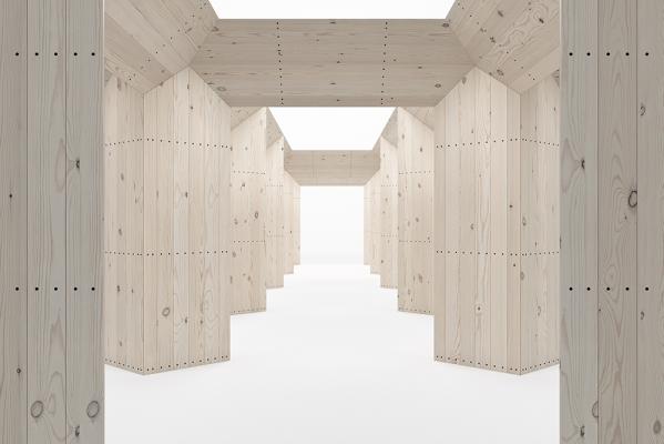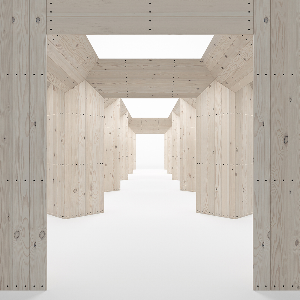 ”Den svenska designpaviljongen 2019 är byggd helt i furu i en form som för tankarna till ett tempel. De överdimensionerade pelarna och balkarna skapar tolv lika stora rum, placerade i en arkad runt ett centralt atrium. Genom att placera de kvadratiska pelarna diagonalt skapas siktlinjer som uppmuntrar besökare att röra sig fritt genom de olika rummen. Paviljongen står direkt på mässgolvet för att bokstavligen sänka trösklarna och förenkla steget in i utställningen.