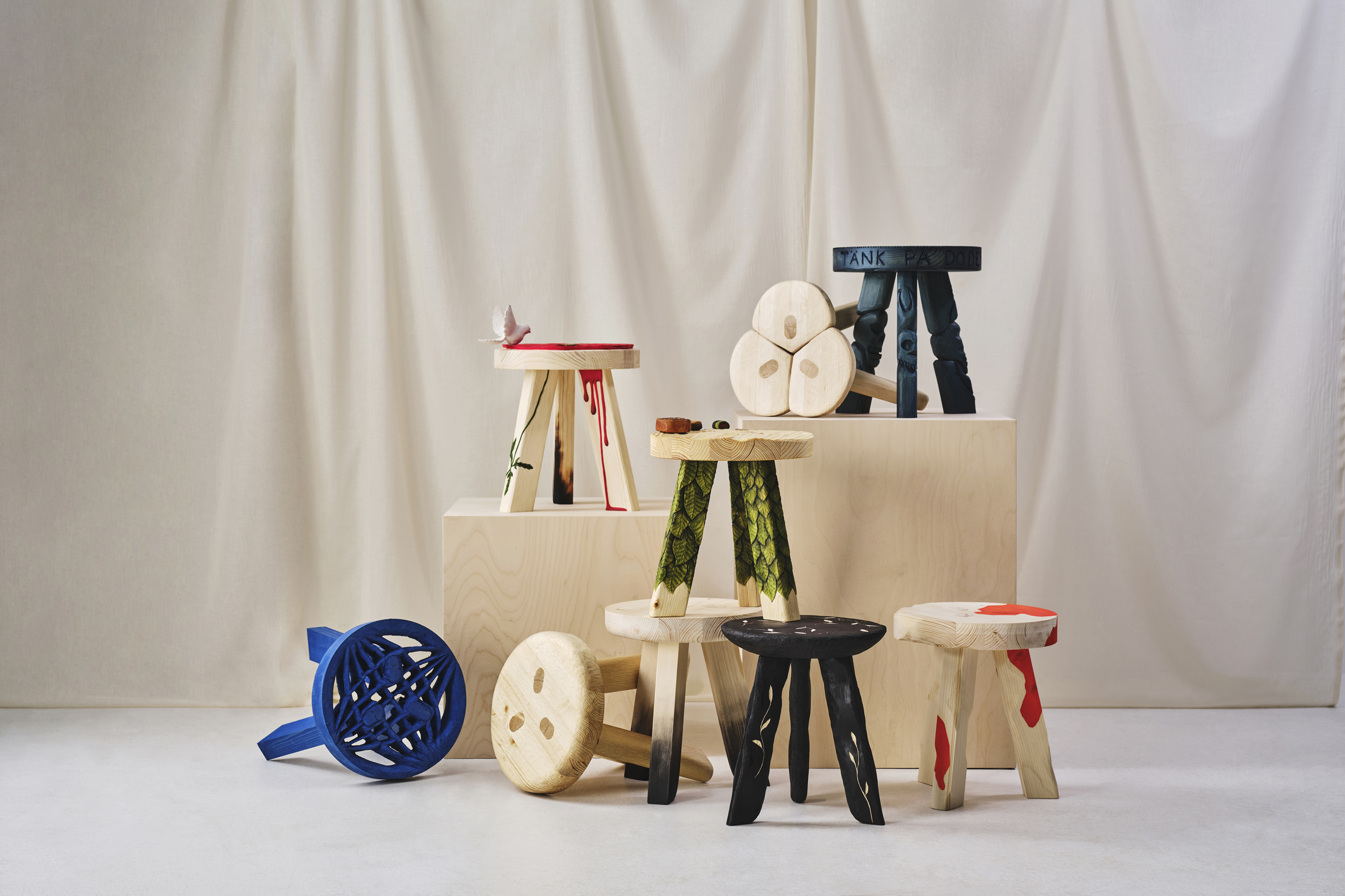 De nio formgivarna har olika bakgrunder. En del är slöjdare, andra möbel-, mode- och industridesigners. Det resulterar i 9 pallar, 9 historier och 9 helt olika uttryck.